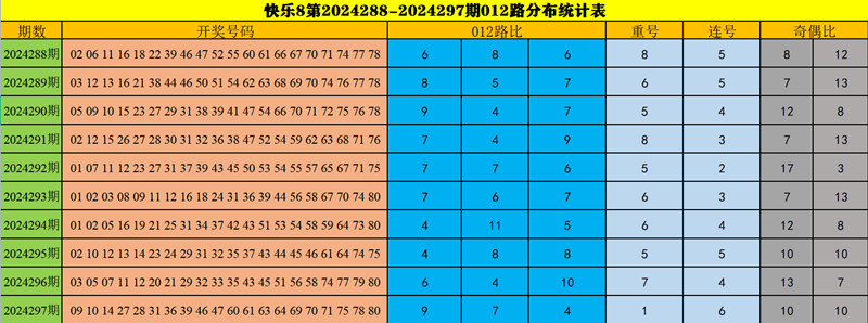 福彩快乐8第2024297期奖号开出:09 10 14 27 28 31 36 39 46 47 60 61 63 64 69 70 71 75 78 80,奖号奇偶比为10:10,012路比为9:7:4,大小比为12:8,开出1枚重号80,开出6组连号09 10、27 28、46 47、60 61、63 64、69 70 71。
