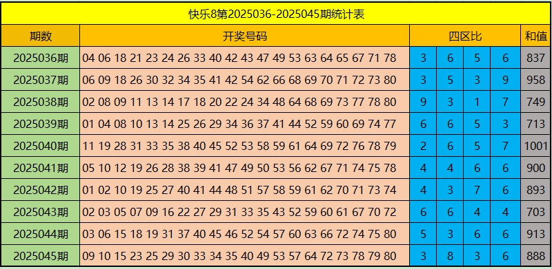 快乐8第2025045期开出奖号:09 10 15 23 25 29 30 33 34 35 40 49 53 57 64 72 73 78 79 80。号码大小比为9:11,四区比为3:8:3:6,奇偶比为12:8。开出5枚重号,开出5组连号。