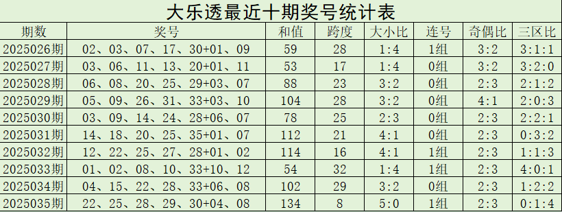 大小分析: 后区大小比为1:1,大小号分布较为均衡。本期建议继续关注小大组合的开出,推荐奖号为04、08。