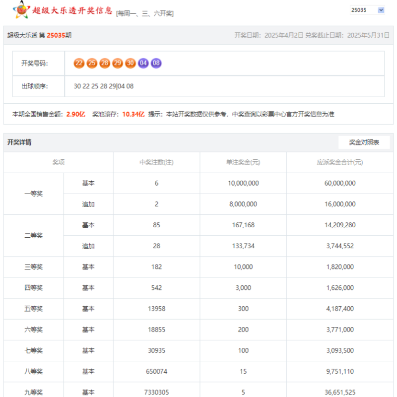 奖号回顾:22、25、28、29、30 + 04、08