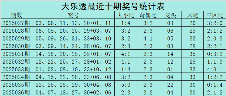 上期三区比为2:1:2,表现相对均衡。最近10期前区三区比多为1:4:0或2:3:0的形式。本期预计三区比为1:3:1,关注二区出现3个号码,三区稍有回暖。
