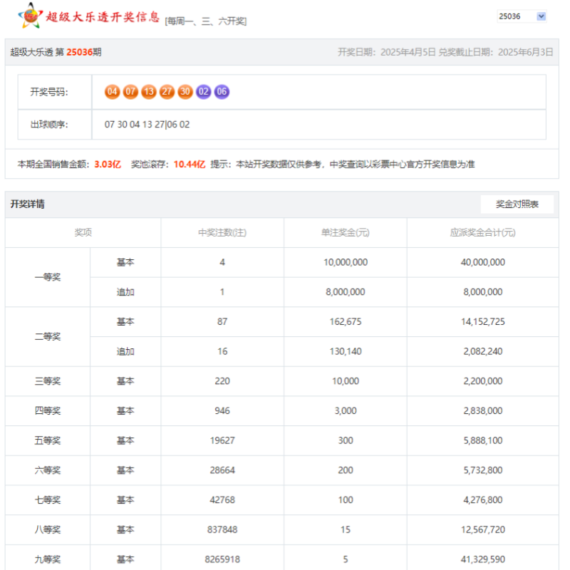 大乐透第2025036期奖号:04、07、13、27、30+02、06