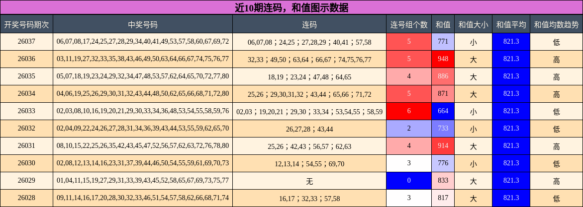 上期第26037期共出现5组连码,分别为06-08、24-25、27-29、40-41、57-58,连码覆盖率达90%,近10期连码开出期数高达9期,走势明显偏热。从连码分析图示(连码分析,和值分析)可见,连码在近10期中几乎每期均有出现,且多期出现2组以上,形成稳定结构。这种高频率的连码出现,表明当前号码分布存在较强的聚集性与连续性特征。