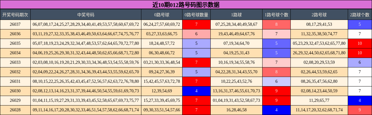 上期开奖回顾:快乐8第26037期开奖号码为6,7,8,17,24,25,27,28,29,34,40,41,49,53,57,58,60,67,69,72。连码组包括06,07,08;24,25;27,28,29;40,41;57,58。和值为771。0路号码开出7个,1路开出8个,2路开出5个。