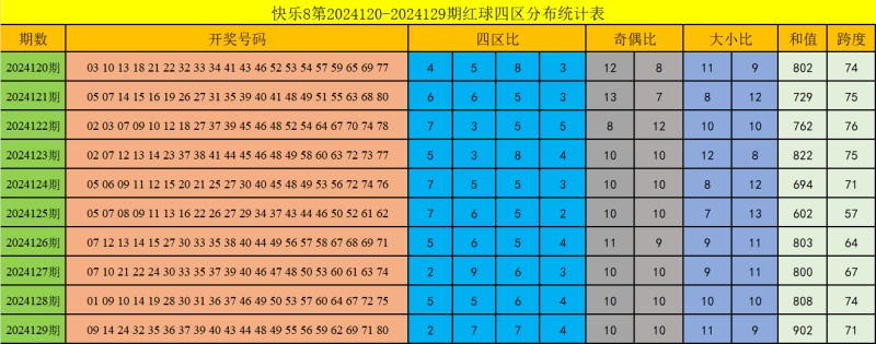 快乐8第2024129期奖号回顾:09 14 24 32 35 36 37 39 40 43 44 48 49 55 56 59 62 69 71 80;和值902,跨度71,奇偶比10:10,大小比11:9,质合比4:16,012路比6:5:9,开出5组连号。