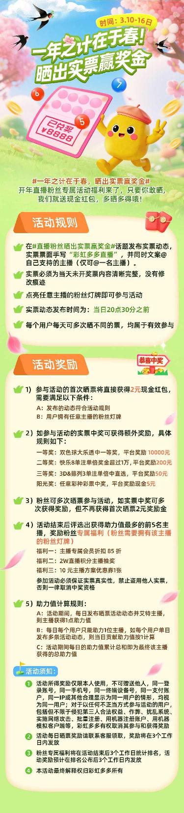 【一年之计在于春,晒出实票赢奖金】开年直播粉丝专属活动福利来了,只要你敢晒,我们就送现金红包!晒票并艾特你支持的主播更有机会获得主播专属会员折扣券!活动详情见海报!