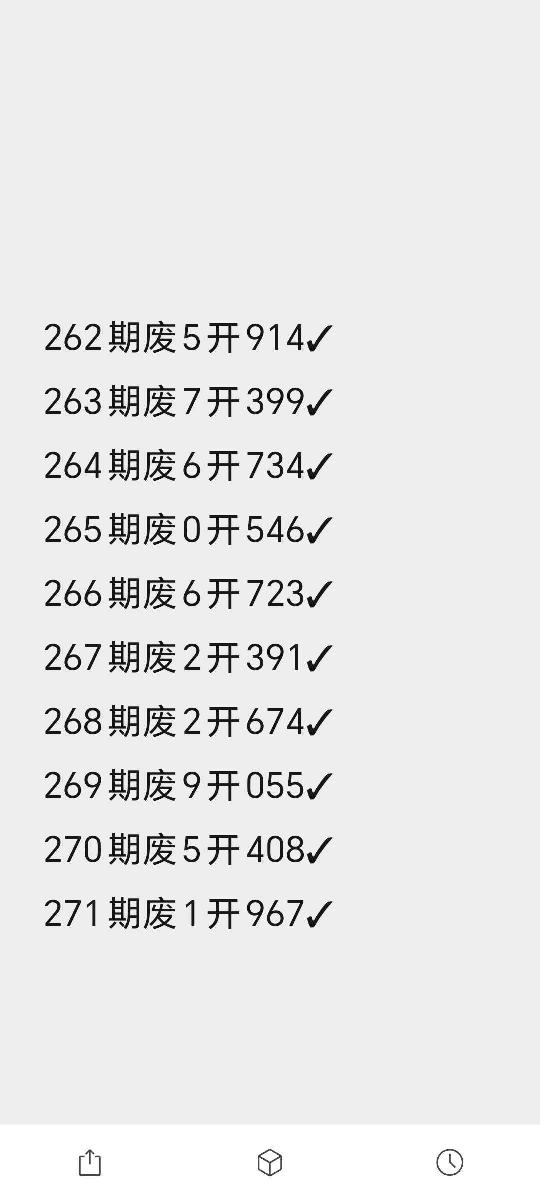 福彩3D 266期六码组选123678✅ 267期六码组选014569❎ 268期六码组选034678✅ 269期六码组选234689❎ 270期六码组选014789✅ 271期六码组选012579✅ 272期六码组选236789 更多资讯请关注老骆彩虹号。 上期三码定位中直。