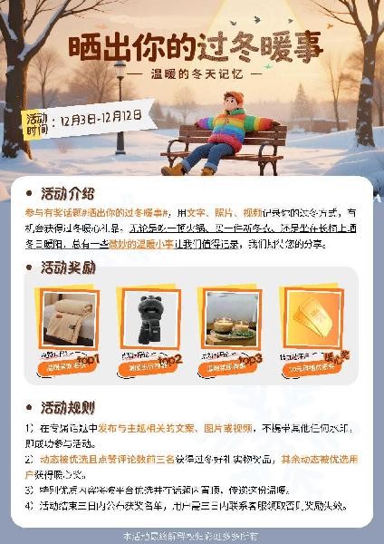 双十二互动话题【晒出你的过冬暖事】 ..............饱眼福...........暖人心............... 活动期间在话题中发布动态并被优选 有机会获温暖毛毯、出行神器、氛围香薰、直播优惠券等好礼 ..........点击图2查看活动参与规则.......