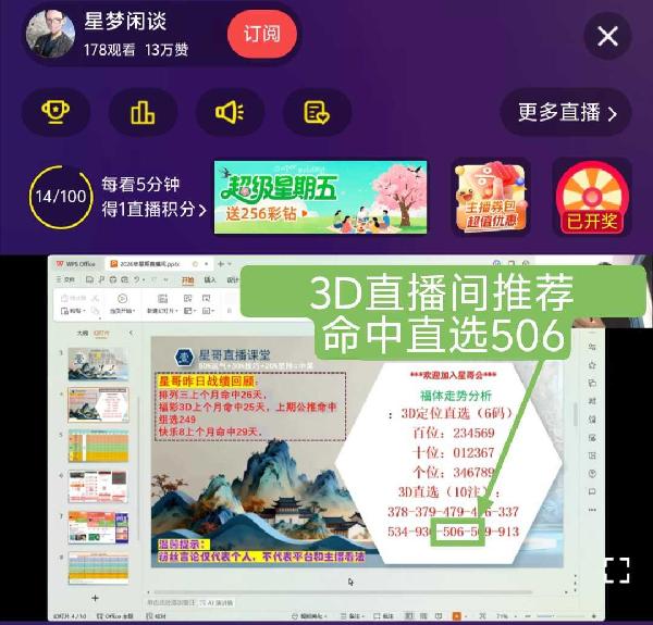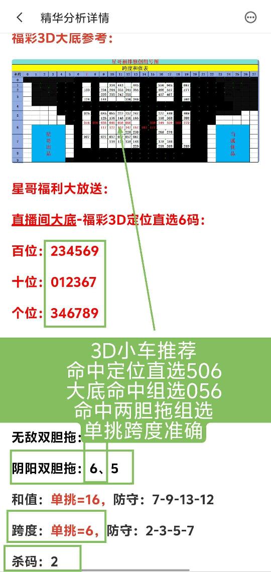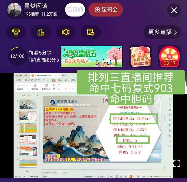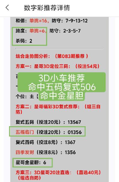 ⭐星粉们,花开四月!周六快乐! 🔑小车推荐方案已发,🉑查看! 🀄福彩3D昨天命中直选506,命中定位直选,大底组选056,命中五码复式、两胆拖组选及金星胆!单挑跨度准确,杀码准确!前天命中组选249,连续命中 🀄排列三昨天命中复式903,命中胆码! 🀄快乐八昨天圈子命中胆码及选二! ⭕圈子福利多多,欢迎入圈!月卡入圈更划算,🉑看30次小车入圈一个月!抓紧机会! 🌹感谢昨天来到直播间支持捧场的大哥大姐,特别感谢:参源大哥、宇鑫姐 ㊗️星哥会家人,马年大吉!财源茂盛! 🚀下午六点直播间不见不散!