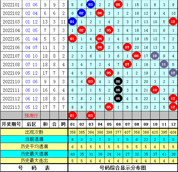 6、在第114期历史同期开奖中,后区奖号跨度分别开出:1-4-8-9-6-8-3-8-4-11-1-7-4-10,跨度范围在1-11之间,本期后区跨度参考2。