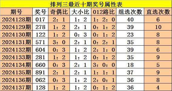 上期回顾:体彩排列三第2024137期奖号:128,奇偶比1:2,大小比1:2,012比0:1:2。