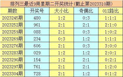 三、体彩排列三前9周星期二奖号分别开出:480-961-088-234-606-029-154-761-728,其中号码012路比为11:8:8,奇偶比为9:18,大小比为13:14;