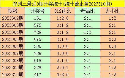 一、排列三第2023310期开出号码417,其奇偶比为2:1,大小比为1:2,号码012路比为0:3:0。该号码直选历史上出现了7次。