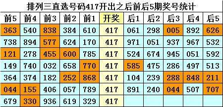 四、排列三直选号码417历史上开出7次,其前后五期奖号分别为: