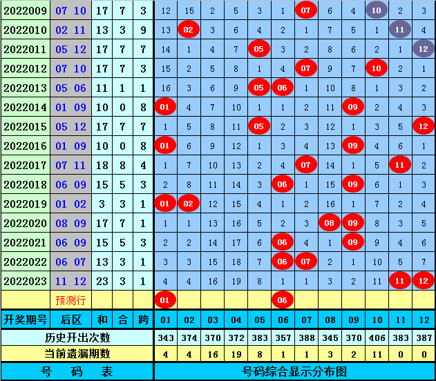 后区分析(定义:01-04为一区,05-08为二区,09-12为三区):上期后区开出奖号11和12,全在第三区出现,,最近10期后区三个区间落号个数比为4:7:9,本期后区看好第二区号码大热,注意两码01、06。