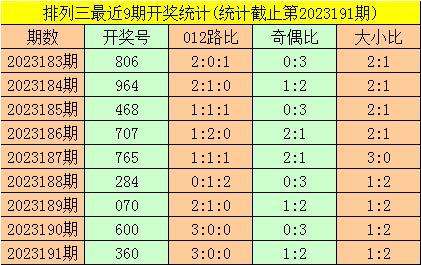 一、排列三第2023191期开出号码360,其奇偶比为1:2,大小比为1:2,号码012路比为3:0:0。该号码直选历史上出现了7次。