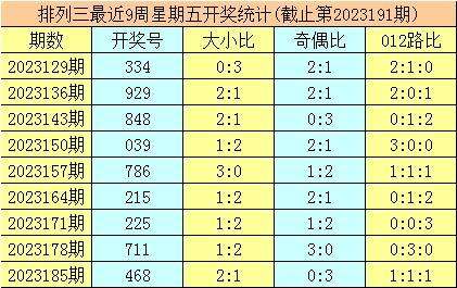 三、体彩排列三前9周星期五奖号分别开出:334-929-848-039-786-215-225-711-468,其中号码012路比为9:8:10,奇偶比为13:14,大小比为13:14;