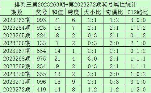 上期回顾:排列三第2023272期开奖号:419,奖号和值:14,奇偶比1:2,大小比1:2。