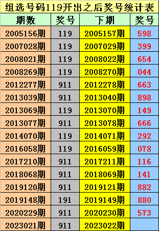 排列三组选119出现之后下期分别开出:598、399、654、044、663、898、149、666、292、078、116、141、882、880、573。