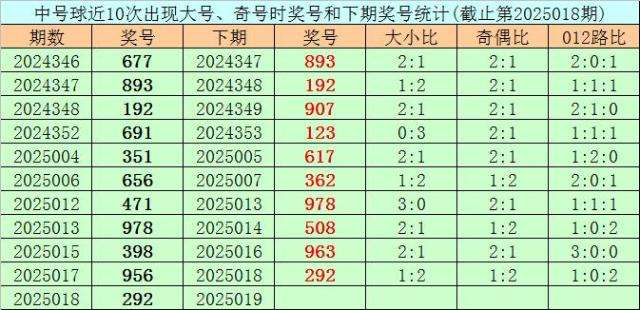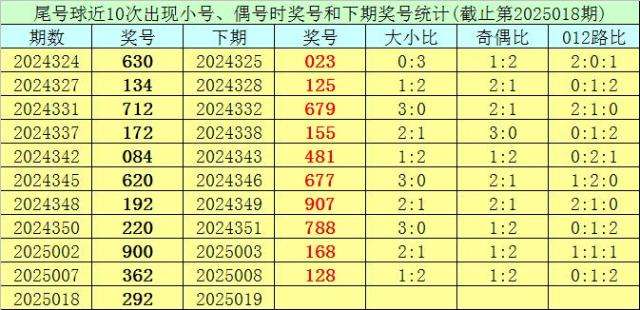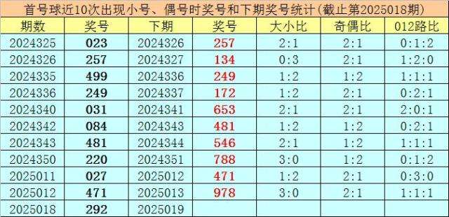 开奖回顾:体彩排列三第2025018期开出奖号292,奖号大小比开出1:2,奇偶比开出1:2,012路比开出1:0:2。