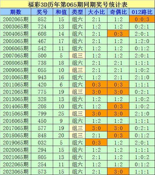 组选类型判断:在第065期历史同期开奖中,组六开出16次,组三开出6次,今年同期看好开出组六号码。