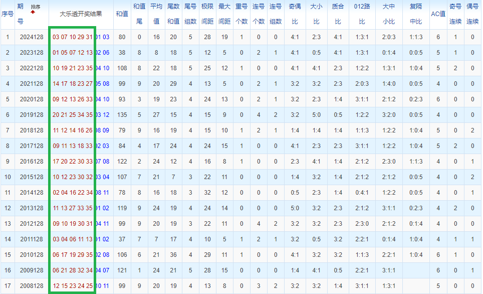 通过观察,我发现往年同期的开奖数据与本期号码之间存在显著关联。具体来说,在前区号码中,从第一位至第五位,通常会有约三个位置上的数字与往年同期相同位置的号码一致;而后区号码中,也有多期开奖结果直接包含了往年同期的数字。因此,我们可以借助往年同期各位置上的号码,作为分析本期开奖情况的重要依据。在此基础上,还可结合往年同期的其他相关条件,进行综合性的号码组合推荐。