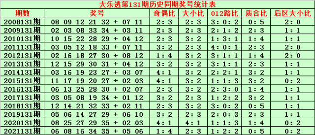 大乐透第131期历史同期奖号分析: