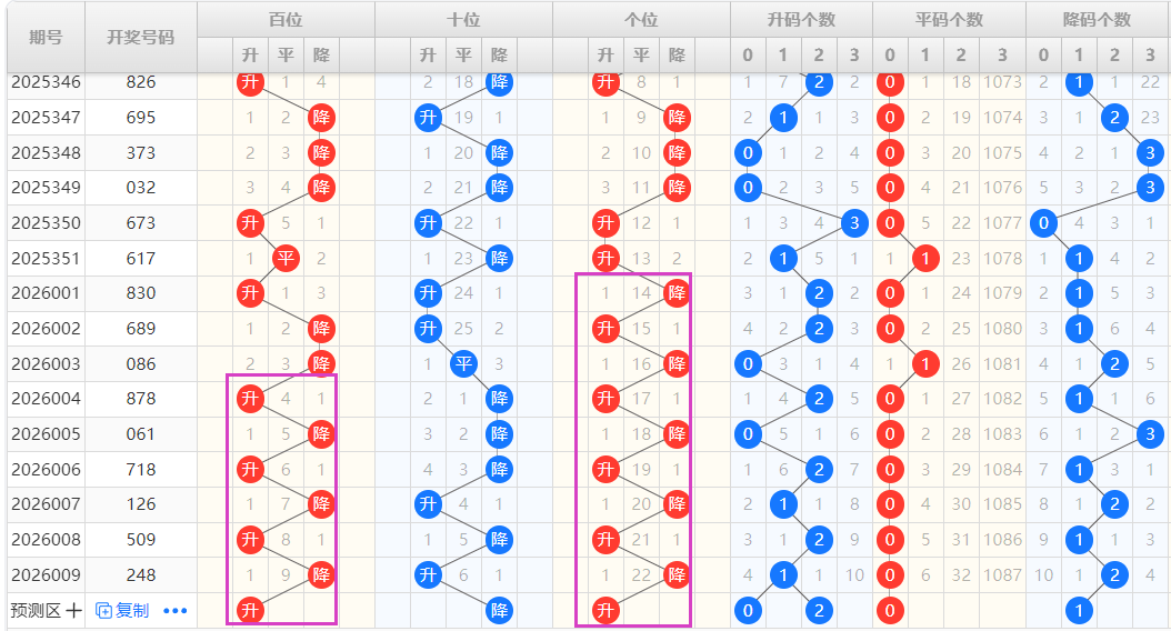 【排列3个位】:近期升降走势为:升-降-升-降-升-降,为一种交错走势,结合走势图可以看出,图中紫色框圈出为一种M形态的出球方式,本期可以重点看好升的形态号码的开出。