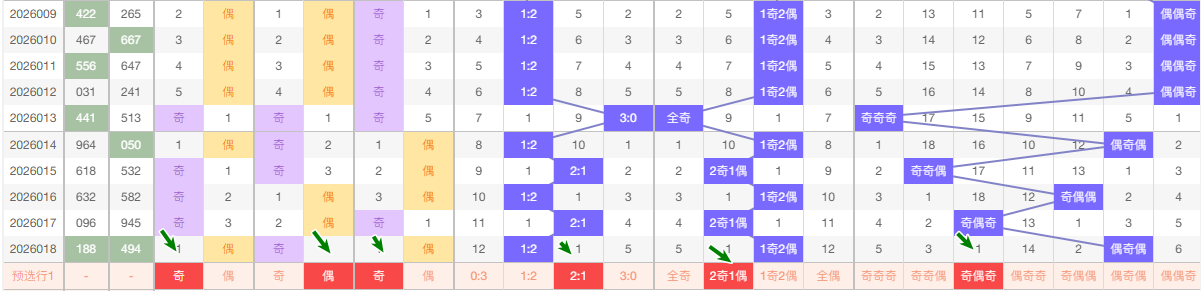 (二)、奇偶分析 奇数 13579 偶数 02468 在这5期 数据中 奇数出现7次 偶数出现 8次 从昨天出号来看偶数占优, 本期看好偶数有号 看好 偶奇奇 奇偶奇