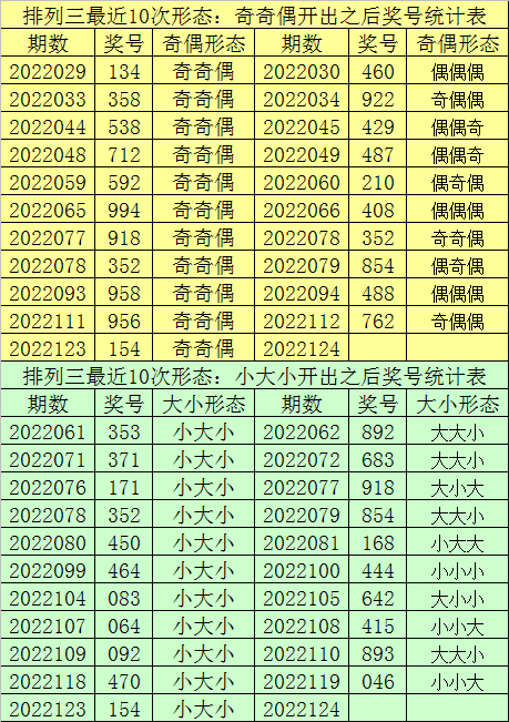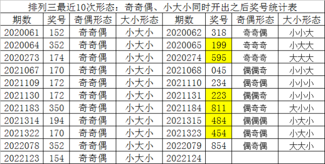 排列三最近10次同时开出奇偶形态:奇奇偶和大小形态:小大小时其奖号分别为:152-352-174-170-172-172-350-194-170-352-154,下期分别开出号码为:318-199-595-045-234-223-811-484-454-854,详细统计见下表: