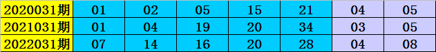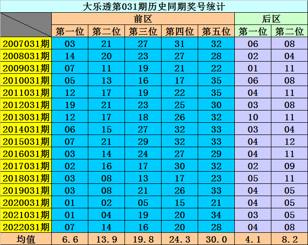 在2020031期-2022031期同周期奖号中,前区连码出现2期,同尾号出现2期,号码奇偶比7:8,大小比6:9,号码012路比2:8:5,前区开出13个号码。