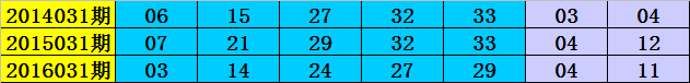 在2014031期-2016031期同周期奖号中,前区连码出现2期,同尾号出现1期,号码奇偶比10:5,大小比10:5,号码012路比9:1:5,前区开出11个号码。