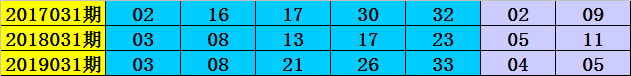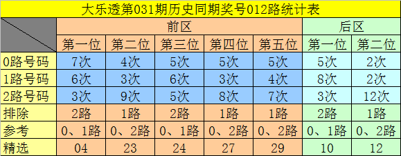 历史号码分析:在大乐透第031期同期奖号中前区连码出现概率为63%,同尾号出现概率为69%。后区第一位0、1路出现概率为81%,第二位0、2路出现概率为19%。