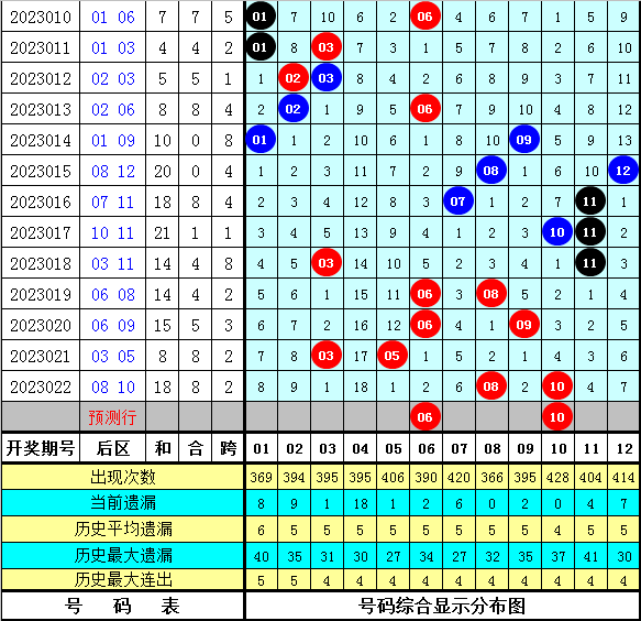 7、在第023期历史同期开奖中,后区奖号跨度分别开出:2-3-4-6-10-1-2-4-8-5-3-6-5-5-7-1,跨度范围在1-10之间,本期后区跨度参考4。