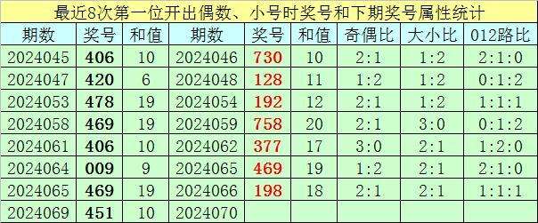 前7次第一位号码开出偶数、小号时奖号分别为:406、420、478、469、406、009、469,其中奇偶总比例为4:17,每期奖号奇偶比与上期奖号奇偶比都不相等;号码大小总比例为9:12,有3期奖号大小比与上期大小比相同;