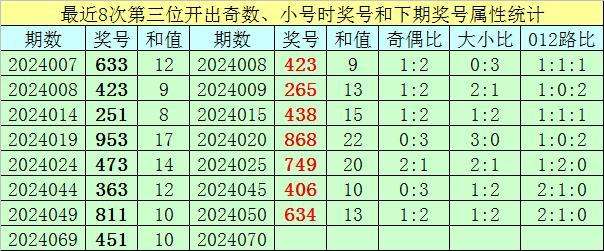 前7次第三位号码开出奇数、小号时奖号分别为:633、423、251、953、473、363、811,其中奇偶总比例为14:7,有5期奇偶比与上期奇偶比相同;号码大小总比例为7:14,有5期奖号大小比与上期大小比相同;