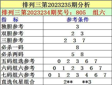 1。排列三最近十期分别开出号码:118-535-901-773-678-949-365-860-124-805,其中有2期奖号开出了上期的重复号码,本期防重号轮空,排除第2023234期奖号:805中的号码,关注号码:7。