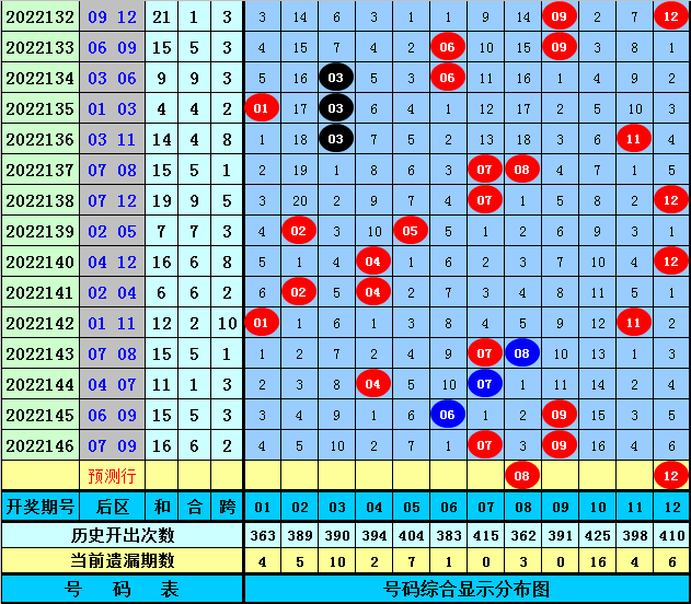 后区分析:上期后区奖号为07+09,遗漏期数为1期+0期。,目前后区热码有5个:04、06、07、08、09,后区温码有5个:01、02、05、11、12,后区冷码有2个:03、10,本期后区看好号码05、07、08、09、12,单挑一注08+12。