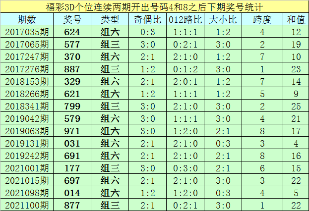 一、上期回顾:福彩3D第2022066期奖号为:968,奖号类型开出组六,大小比为3:0,奇偶比为1:2,和值为23,跨度为3,012路比为2:0:1。