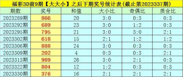 一、上期回顾:福彩3D第2023337期奖号为:862,奖号类型开出组六,大小比为2:1,奇偶比为0:3,和值为16,跨度为6,012路比为1:0:2。