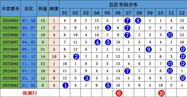 上期开出后区号码:01 05,冷冷组合。冷热分析:近十期,冷冷组合1次,热冷组合2次,冷热组合3次,热热组合4次,总体热热组合出码较热,根据图标分析,本期预测冷冷组合后区回补,关注号码:04 06 08 09 10。精准推荐:06 10。
