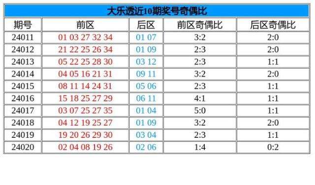 首先我们先来回顾一下上期的大乐透开奖。体彩大乐透第24020期奖号开出:02 04 08 19 26 + 02 06,其中5个前区号码的奇偶比为1:4,2个后区号码的奇偶比为0:2。