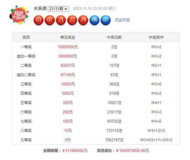 大乐透第2023131期开奖,前区奖号:03、07、21、22、24;后区奖号:06、07。其中前区奖号012路比为3:2:0,后区开出0路+1路号码。