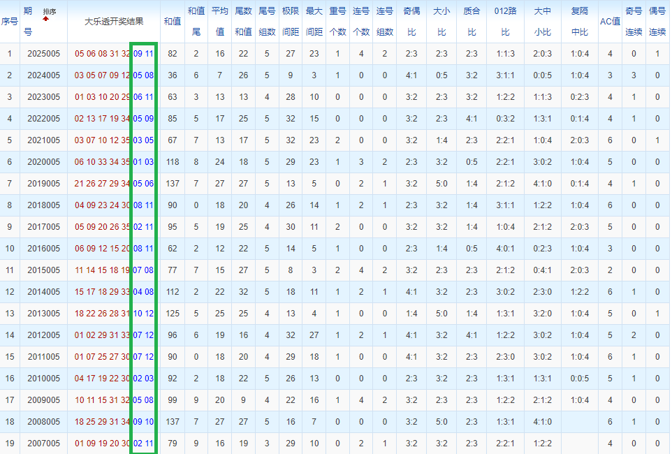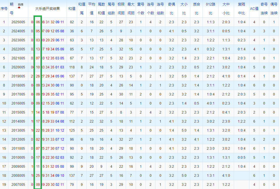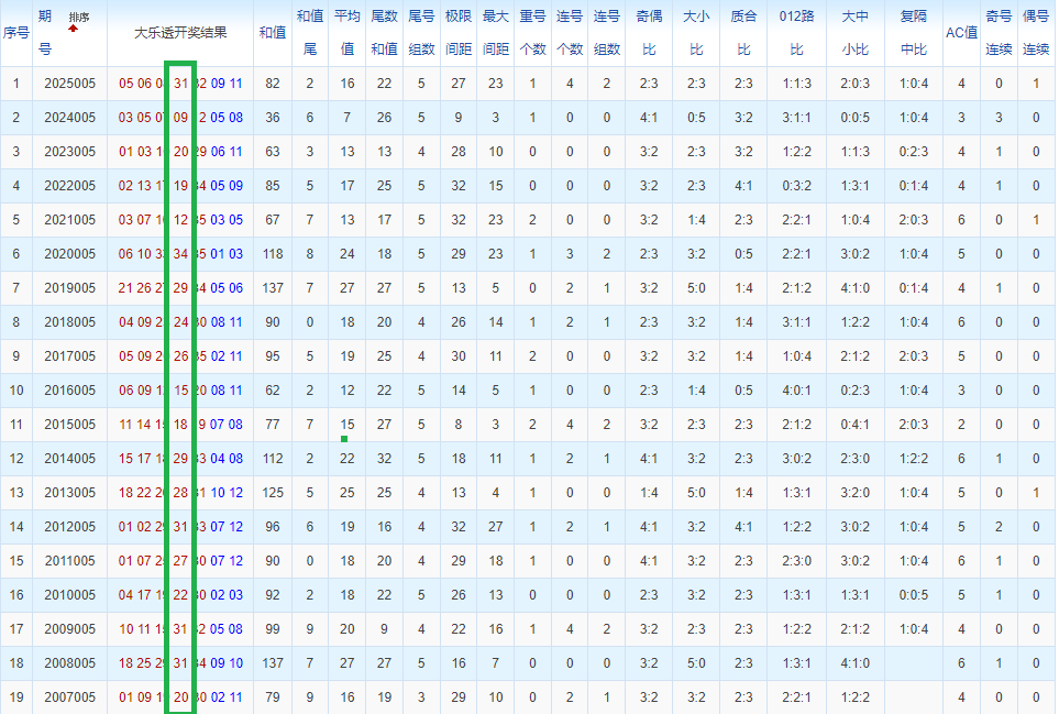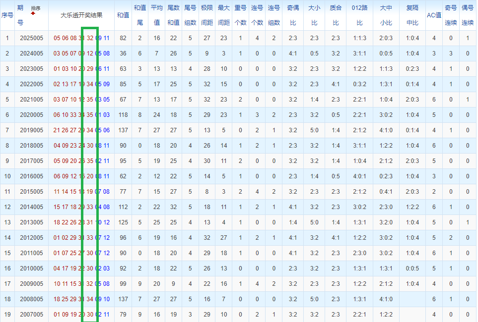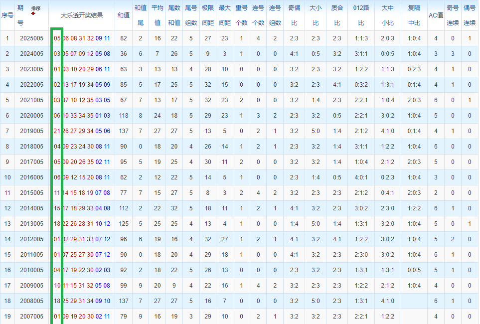 通过观察,我发现往年同期的开奖数据与本期号码之间存在显著关联。具体来说,在前区号码中,从第一位至第五位,通常会有约三个位置上的数字与往年同期相同位置的号码一致;而后区号码中,也有多期开奖结果直接包含了往年同期的数字。因此,我们可以借助往年同期各位置上的号码,作为分析本期开奖情况的重要依据。在此基础上,还可结合往年同期的其他相关条件,进行综合性的号码组合推荐。