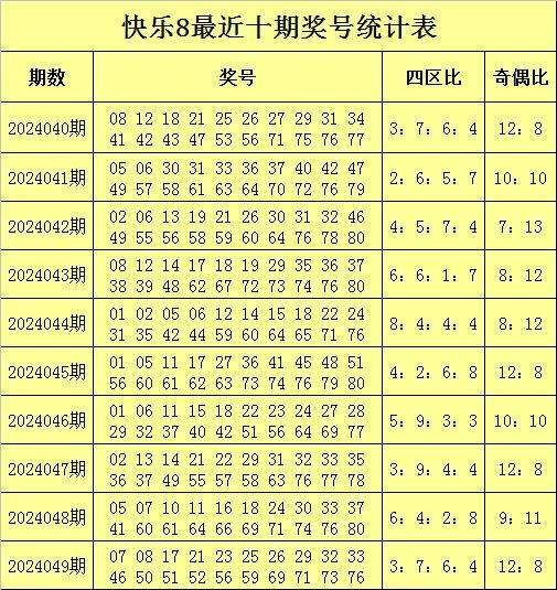 福彩快乐8第2024049期开奖回顾:07 08 17 21 23 25 26 29 32 33 46 50 51 52 56 59 69 71 73 76,其中奖号四区比为3:7:6:4,奇偶比为12:8。