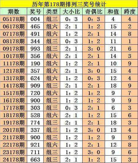 排列三第2024178期奖号:663,和值15,跨度3,大小比2:1,奇偶比1:2。