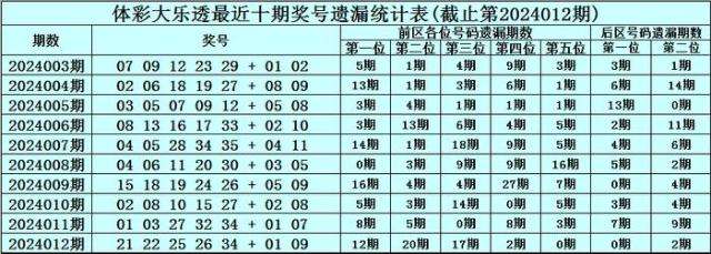 第2024012期奖号:21 22 25 26 34 + 01 09 ,各位号码遗漏期数为:12期、20期、17期、2期、0期 + 0期、2期。