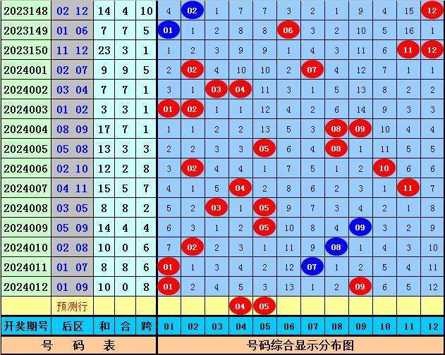 后区分析:后区上期开出号码01和09,分别遗漏0期和2期,目前后区01-12区间冷温热号码个数比为2:4:6,本期后区注意号码04+05。
