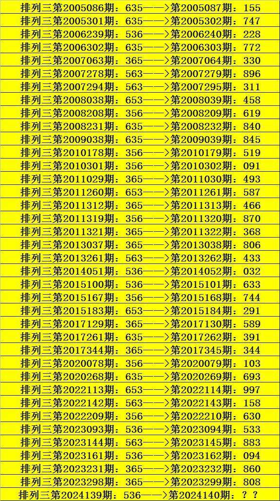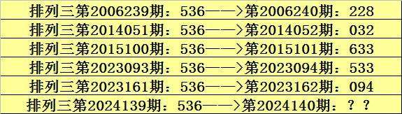 第2024139期排列三奖号为536,历史上该号码直选出现6次,下期奖号分别为:228、032、633、533、094。