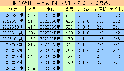 上期回顾:排列三第2023054期奖号为348,组六,大小比开出1:2,直选分布为:小小大。